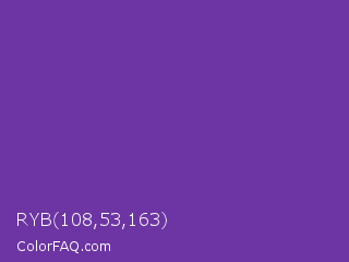 RYB 108,53,163 Color is a normal violet color and the nearest color is Purple Heart #69359c. Hex code #6c35a3 and RGB value is rgb(108,53,163). In RGB color space, this color is composed of 42% red, 21% green, 64% blue, In CMYK color space, this color is composed of 34% cyan, 67% magenta, 0% yellow , 36% black , In HSL color space, this color has a hue angle of 270° , 51% saturation and 42% lightness.