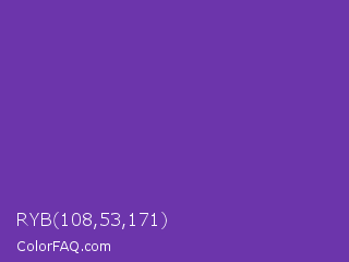 RYB 108,53,171 Color is a normal violet color and the nearest color is Grape #6f2da8. Hex code #6c35ab and RGB value is rgb(108,53,171). In RGB color space, this color is composed of 42% red, 21% green, 67% blue, In CMYK color space, this color is composed of 37% cyan, 69% magenta, 0% yellow , 33% black , In HSL color space, this color has a hue angle of 268° , 53% saturation and 44% lightness.