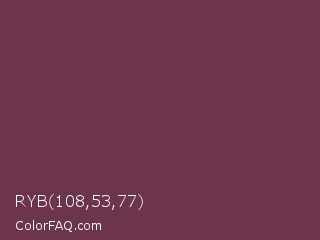 RYB 108,53,77 Color is a normal rose color and the nearest color is Wine Dregs #673147. Hex code #6c354d and RGB value is rgb(108,53,77). In RGB color space, this color is composed of 42% red, 21% green, 30% blue, In CMYK color space, this color is composed of 0% cyan, 51% magenta, 29% yellow , 58% black , In HSL color space, this color has a hue angle of 334° , 34% saturation and 32% lightness.