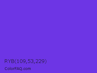 RYB 109,53,229 Color is a normal indigo color and the nearest color is Blue Violet #8a2be2. Hex code #6d35e5 and RGB value is rgb(109,53,229). In RGB color space, this color is composed of 43% red, 21% green, 90% blue, In CMYK color space, this color is composed of 52% cyan, 77% magenta, 0% yellow , 10% black , In HSL color space, this color has a hue angle of 259° , 77% saturation and 55% lightness.
