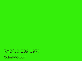 RYB 10,239,197 Color is a normal green color and the nearest color is Neon Green #39ff14. Hex code #34ef0a and RGB value is rgb(52,239,10). In RGB color space, this color is composed of 20% red, 94% green, 4% blue, In CMYK color space, this color is composed of 78% cyan, 0% magenta, 96% yellow , 6% black , In HSL color space, this color has a hue angle of 109° , 92% saturation and 49% lightness.
