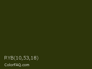 RYB 10,53,18 Color is a very dark lime color and the nearest color is Turtle Green #2a380b. Hex code #2d350a and RGB value is rgb(45,53,10). In RGB color space, this color is composed of 18% red, 21% green, 4% blue, In CMYK color space, this color is composed of 15% cyan, 0% magenta, 81% yellow , 79% black , In HSL color space, this color has a hue angle of 71° , 68% saturation and 12% lightness.