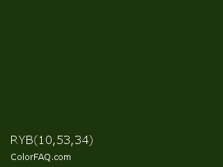 RYB 10,53,34 Color is a very dark green color and the nearest color is Palm Leaf #19330e. Hex code #1d350a and RGB value is rgb(29,53,10). In RGB color space, this color is composed of 11% red, 21% green, 4% blue, In CMYK color space, this color is composed of 45% cyan, 0% magenta, 81% yellow , 79% black , In HSL color space, this color has a hue angle of 93° , 68% saturation and 12% lightness.