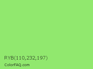 RYB 110,232,197 Color is a light green color and the nearest color is Pastel Green #77dd77. Hex code #91e86e and RGB value is rgb(145,232,110). In RGB color space, this color is composed of 57% red, 91% green, 43% blue, In CMYK color space, this color is composed of 38% cyan, 0% magenta, 53% yellow , 9% black , In HSL color space, this color has a hue angle of 103° , 73% saturation and 67% lightness.