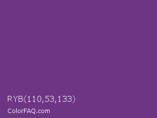 RYB 110,53,133 Color is a normal purple color and the nearest color is Eminence #6c3082. Hex code #6e3585 and RGB value is rgb(110,53,133). In RGB color space, this color is composed of 43% red, 21% green, 52% blue, In CMYK color space, this color is composed of 17% cyan, 60% magenta, 0% yellow , 48% black , In HSL color space, this color has a hue angle of 283° , 43% saturation and 36% lightness.
