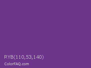 RYB 110,53,140 Color is a normal purple color and the nearest color is Eminence #6c3082. Hex code #6e358c and RGB value is rgb(110,53,140). In RGB color space, this color is composed of 43% red, 21% green, 55% blue, In CMYK color space, this color is composed of 21% cyan, 62% magenta, 0% yellow , 45% black , In HSL color space, this color has a hue angle of 279° , 45% saturation and 38% lightness.