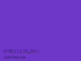 RYB 110,53,201 Color is a normal violet color and the nearest color is Purple Heart Crayola #652dc1. Hex code #6e35c9 and RGB value is rgb(110,53,201). In RGB color space, this color is composed of 43% red, 21% green, 79% blue, In CMYK color space, this color is composed of 45% cyan, 74% magenta, 0% yellow , 21% black , In HSL color space, this color has a hue angle of 263° , 58% saturation and 50% lightness.