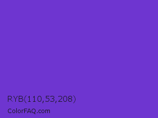 RYB 110,53,208 Color is a normal violet color and the nearest color is Purple Heart Crayola #652dc1. Hex code #6e35d0 and RGB value is rgb(110,53,208). In RGB color space, this color is composed of 43% red, 21% green, 82% blue, In CMYK color space, this color is composed of 47% cyan, 75% magenta, 0% yellow , 18% black , In HSL color space, this color has a hue angle of 262° , 62% saturation and 51% lightness.