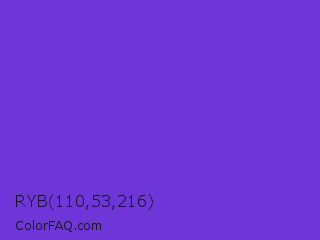 RYB 110,53,216 Color is a normal violet color and the nearest color is Purple Heart Crayola #652dc1. Hex code #6e35d8 and RGB value is rgb(110,53,216). In RGB color space, this color is composed of 43% red, 21% green, 85% blue, In CMYK color space, this color is composed of 49% cyan, 75% magenta, 0% yellow , 15% black , In HSL color space, this color has a hue angle of 261° , 68% saturation and 53% lightness.