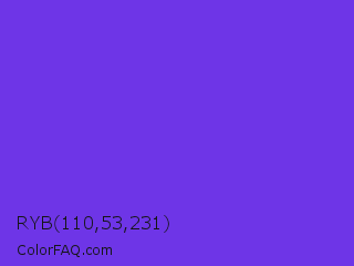 RYB 110,53,231 Color is a normal indigo color and the nearest color is Blue Violet #8a2be2. Hex code #6e35e7 and RGB value is rgb(110,53,231). In RGB color space, this color is composed of 43% red, 21% green, 91% blue, In CMYK color space, this color is composed of 52% cyan, 77% magenta, 0% yellow , 9% black , In HSL color space, this color has a hue angle of 259° , 79% saturation and 56% lightness.
