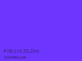 RYB 110,53,254 Color is a normal indigo color and the nearest color is Han Purple #5218fa. Hex code #6e35fe and RGB value is rgb(110,53,254). In RGB color space, this color is composed of 43% red, 21% green, 100% blue, In CMYK color space, this color is composed of 57% cyan, 79% magenta, 0% yellow , 0% black , In HSL color space, this color has a hue angle of 257° , 99% saturation and 60% lightness.