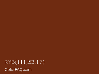 RYB 111,53,17 Color is a dark orange color and the nearest color is Hairy Heath #6b2a14. Hex code #6f2b11 and RGB value is rgb(111,43,17). In RGB color space, this color is composed of 44% red, 17% green, 7% blue, In CMYK color space, this color is composed of 0% cyan, 61% magenta, 85% yellow , 56% black , In HSL color space, this color has a hue angle of 17° , 73% saturation and 25% lightness.