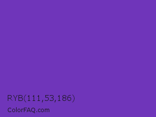 RYB 111,53,186 Color is a normal violet color and the nearest color is Purple Heart Crayola #652dc1. Hex code #6f35ba and RGB value is rgb(111,53,186). In RGB color space, this color is composed of 44% red, 21% green, 73% blue, In CMYK color space, this color is composed of 40% cyan, 72% magenta, 0% yellow , 27% black , In HSL color space, this color has a hue angle of 266° , 56% saturation and 47% lightness.
