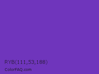 RYB 111,53,188 Color is a normal violet color and the nearest color is Purple Heart Crayola #652dc1. Hex code #6f35bc and RGB value is rgb(111,53,188). In RGB color space, this color is composed of 44% red, 21% green, 74% blue, In CMYK color space, this color is composed of 41% cyan, 72% magenta, 0% yellow , 26% black , In HSL color space, this color has a hue angle of 266° , 56% saturation and 47% lightness.
