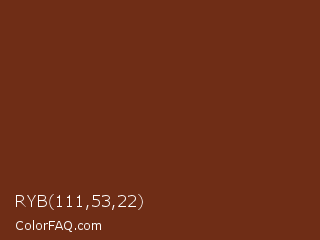 RYB 111,53,22 Color is a dark orange color and the nearest color is Hairy Heath #6b2a14. Hex code #6f2d16 and RGB value is rgb(111,45,22). In RGB color space, this color is composed of 44% red, 18% green, 9% blue, In CMYK color space, this color is composed of 0% cyan, 59% magenta, 80% yellow , 56% black , In HSL color space, this color has a hue angle of 16° , 67% saturation and 26% lightness.