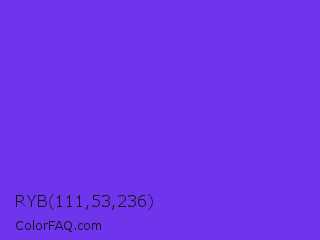RYB 111,53,236 Color is a normal indigo color and the nearest color is Blue Violet #8a2be2. Hex code #6f35ec and RGB value is rgb(111,53,236). In RGB color space, this color is composed of 44% red, 21% green, 93% blue, In CMYK color space, this color is composed of 53% cyan, 78% magenta, 0% yellow , 7% black , In HSL color space, this color has a hue angle of 259° , 83% saturation and 57% lightness.