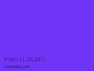 RYB 111,53,247 Color is a normal indigo color and the nearest color is Blue Violet #8a2be2. Hex code #6f35f7 and RGB value is rgb(111,53,247). In RGB color space, this color is composed of 44% red, 21% green, 97% blue, In CMYK color space, this color is composed of 55% cyan, 79% magenta, 0% yellow , 3% black , In HSL color space, this color has a hue angle of 258° , 92% saturation and 59% lightness.