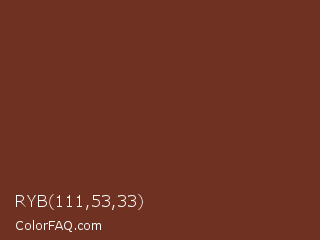 RYB 111,53,33 Color is a dark red color and the nearest color is Liver Organ #6c2e1f. Hex code #6f3121 and RGB value is rgb(111,49,33). In RGB color space, this color is composed of 44% red, 19% green, 13% blue, In CMYK color space, this color is composed of 0% cyan, 56% magenta, 70% yellow , 56% black , In HSL color space, this color has a hue angle of 12° , 54% saturation and 28% lightness.