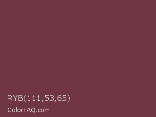 RYB 111,53,65 Color is a normal red color and the nearest color is Catawba #703642. Hex code #6f3541 and RGB value is rgb(111,53,65). In RGB color space, this color is composed of 44% red, 21% green, 25% blue, In CMYK color space, this color is composed of 0% cyan, 52% magenta, 41% yellow , 56% black , In HSL color space, this color has a hue angle of 348° , 35% saturation and 32% lightness.