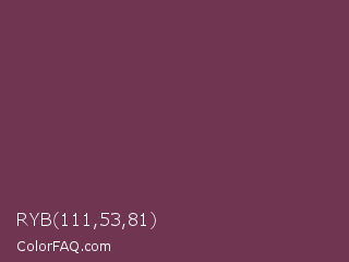 RYB 111,53,81 Color is a normal rose color and the nearest color is Ube Halaya #663854. Hex code #6f3551 and RGB value is rgb(111,53,81). In RGB color space, this color is composed of 44% red, 21% green, 32% blue, In CMYK color space, this color is composed of 0% cyan, 52% magenta, 27% yellow , 56% black , In HSL color space, this color has a hue angle of 331° , 35% saturation and 32% lightness.