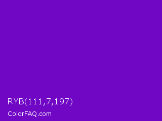 RYB 111,7,197 Color is a normal purple color and the nearest color is French Violet #8806ce. Hex code #6f07c5 and RGB value is rgb(111,7,197). In RGB color space, this color is composed of 44% red, 3% green, 77% blue, In CMYK color space, this color is composed of 44% cyan, 96% magenta, 0% yellow , 23% black , In HSL color space, this color has a hue angle of 273° , 93% saturation and 40% lightness.