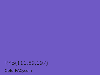 RYB 111,89,197 Color is a normal indigo color and the nearest color is Slate Blue #6a5acd. Hex code #6f59c5 and RGB value is rgb(111,89,197). In RGB color space, this color is composed of 44% red, 35% green, 77% blue, In CMYK color space, this color is composed of 44% cyan, 55% magenta, 0% yellow , 23% black , In HSL color space, this color has a hue angle of 252° , 48% saturation and 56% lightness.