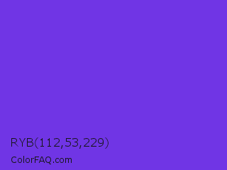 RYB 112,53,229 Color is a normal indigo color and the nearest color is Blue Violet #8a2be2. Hex code #7035e5 and RGB value is rgb(112,53,229). In RGB color space, this color is composed of 44% red, 21% green, 90% blue, In CMYK color space, this color is composed of 51% cyan, 77% magenta, 0% yellow , 10% black , In HSL color space, this color has a hue angle of 260° , 77% saturation and 55% lightness.
