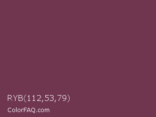 RYB 112,53,79 Color is a normal rose color and the nearest color is Ube Halaya #663854. Hex code #70354f and RGB value is rgb(112,53,79). In RGB color space, this color is composed of 44% red, 21% green, 31% blue, In CMYK color space, this color is composed of 0% cyan, 53% magenta, 29% yellow , 56% black , In HSL color space, this color has a hue angle of 334° , 36% saturation and 32% lightness.