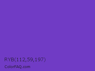 RYB 112,59,197 Color is a normal violet color and the nearest color is Purple Heart Crayola #652dc1. Hex code #703bc5 and RGB value is rgb(112,59,197). In RGB color space, this color is composed of 44% red, 23% green, 77% blue, In CMYK color space, this color is composed of 43% cyan, 70% magenta, 0% yellow , 23% black , In HSL color space, this color has a hue angle of 263° , 54% saturation and 50% lightness.