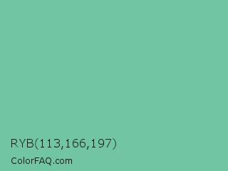 RYB 113,166,197 Color is a light green color and the nearest color is Green Sheen #6eaea1. Hex code #71c5a2 and RGB value is rgb(113,197,162). In RGB color space, this color is composed of 44% red, 77% green, 64% blue, In CMYK color space, this color is composed of 43% cyan, 0% magenta, 18% yellow , 23% black , In HSL color space, this color has a hue angle of 155° , 42% saturation and 61% lightness.