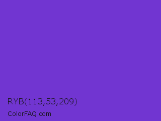 RYB 113,53,209 Color is a normal violet color and the nearest color is Purple Heart Crayola #652dc1. Hex code #7135d1 and RGB value is rgb(113,53,209). In RGB color space, this color is composed of 44% red, 21% green, 82% blue, In CMYK color space, this color is composed of 46% cyan, 75% magenta, 0% yellow , 18% black , In HSL color space, this color has a hue angle of 263° , 63% saturation and 51% lightness.