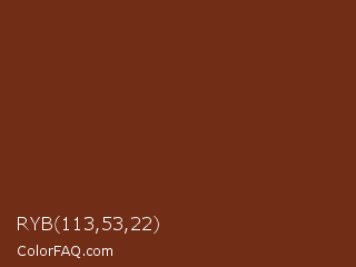 RYB 113,53,22 Color is a dark color and the nearest color is Hairy Heath #6b2a14. Hex code #712d16 and RGB value is rgb(113,45,22). In RGB color space, this color is composed of 44% red, 18% green, 9% blue, In CMYK color space, this color is composed of 0% cyan, 60% magenta, 81% yellow , 56% black , In HSL color space, this color has a hue angle of 15° , 67% saturation and 26% lightness.