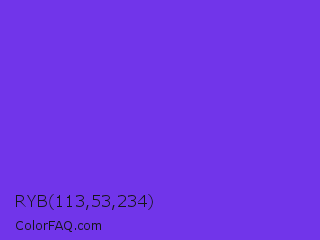 RYB 113,53,234 Color is a normal indigo color and the nearest color is Blue Violet #8a2be2. Hex code #7135ea and RGB value is rgb(113,53,234). In RGB color space, this color is composed of 44% red, 21% green, 92% blue, In CMYK color space, this color is composed of 52% cyan, 77% magenta, 0% yellow , 8% black , In HSL color space, this color has a hue angle of 260° , 81% saturation and 56% lightness.