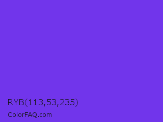 RYB 113,53,235 Color is a normal indigo color and the nearest color is Blue Violet #8a2be2. Hex code #7135eb and RGB value is rgb(113,53,235). In RGB color space, this color is composed of 44% red, 21% green, 92% blue, In CMYK color space, this color is composed of 52% cyan, 77% magenta, 0% yellow , 8% black , In HSL color space, this color has a hue angle of 260° , 82% saturation and 56% lightness.