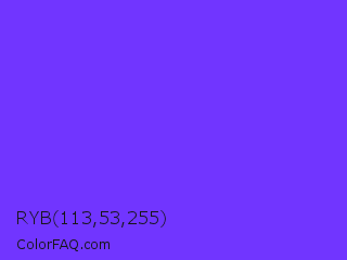 RYB 113,53,255 Color is a normal indigo color and the nearest color is Blue Violet #8a2be2. Hex code #7135ff and RGB value is rgb(113,53,255). In RGB color space, this color is composed of 44% red, 21% green, 100% blue, In CMYK color space, this color is composed of 56% cyan, 79% magenta, 0% yellow , 0% black , In HSL color space, this color has a hue angle of 258° , 100% saturation and 60% lightness.