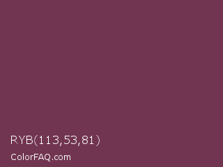 RYB 113,53,81 Color is a normal rose color and the nearest color is Finn #692d54. Hex code #713551 and RGB value is rgb(113,53,81). In RGB color space, this color is composed of 44% red, 21% green, 32% blue, In CMYK color space, this color is composed of 0% cyan, 53% magenta, 28% yellow , 56% black , In HSL color space, this color has a hue angle of 332° , 36% saturation and 33% lightness.