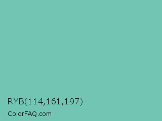 RYB 114,161,197 Color is a light cyan color and the nearest color is Neptune #7cb7bb. Hex code #72c5b2 and RGB value is rgb(114,197,178). In RGB color space, this color is composed of 45% red, 77% green, 70% blue, In CMYK color space, this color is composed of 42% cyan, 0% magenta, 10% yellow , 23% black , In HSL color space, this color has a hue angle of 166° , 42% saturation and 61% lightness.