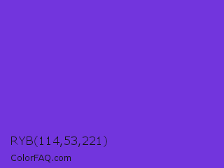 RYB 114,53,221 Color is a normal violet color and the nearest color is Blue Violet #8a2be2. Hex code #7235dd and RGB value is rgb(114,53,221). In RGB color space, this color is composed of 45% red, 21% green, 87% blue, In CMYK color space, this color is composed of 48% cyan, 76% magenta, 0% yellow , 13% black , In HSL color space, this color has a hue angle of 262° , 71% saturation and 54% lightness.
