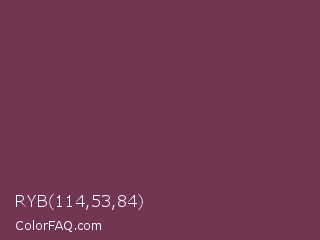 RYB 114,53,84 Color is a normal rose color and the nearest color is Cosmic #76395d. Hex code #723554 and RGB value is rgb(114,53,84). In RGB color space, this color is composed of 45% red, 21% green, 33% blue, In CMYK color space, this color is composed of 0% cyan, 54% magenta, 26% yellow , 55% black , In HSL color space, this color has a hue angle of 330° , 37% saturation and 33% lightness.