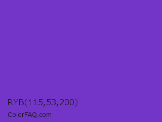 RYB 115,53,200 Color is a normal violet color and the nearest color is Purple Heart Crayola #652dc1. Hex code #7335c8 and RGB value is rgb(115,53,200). In RGB color space, this color is composed of 45% red, 21% green, 78% blue, In CMYK color space, this color is composed of 43% cyan, 74% magenta, 0% yellow , 22% black , In HSL color space, this color has a hue angle of 265° , 58% saturation and 50% lightness.