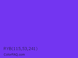 RYB 115,53,241 Color is a normal indigo color and the nearest color is Blue Violet #8a2be2. Hex code #7335f1 and RGB value is rgb(115,53,241). In RGB color space, this color is composed of 45% red, 21% green, 95% blue, In CMYK color space, this color is composed of 52% cyan, 78% magenta, 0% yellow , 5% black , In HSL color space, this color has a hue angle of 260° , 87% saturation and 58% lightness.