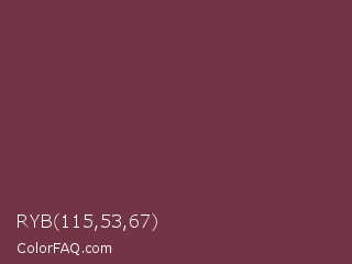 RYB 115,53,67 Color is a normal red color and the nearest color is Catawba #703642. Hex code #733543 and RGB value is rgb(115,53,67). In RGB color space, this color is composed of 45% red, 21% green, 26% blue, In CMYK color space, this color is composed of 0% cyan, 54% magenta, 42% yellow , 55% black , In HSL color space, this color has a hue angle of 346° , 37% saturation and 33% lightness.