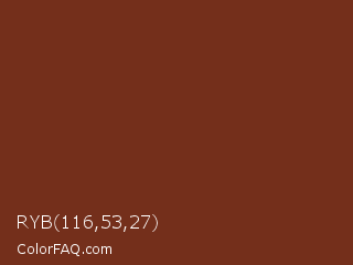 RYB 116,53,27 Color is a dark red color and the nearest color is Mocha #782d19. Hex code #742f1b and RGB value is rgb(116,47,27). In RGB color space, this color is composed of 45% red, 18% green, 11% blue, In CMYK color space, this color is composed of 0% cyan, 59% magenta, 77% yellow , 55% black , In HSL color space, this color has a hue angle of 13° , 62% saturation and 28% lightness.