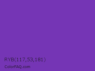 RYB 117,53,181 Color is a normal violet color and the nearest color is Grape #6f2da8. Hex code #7535b5 and RGB value is rgb(117,53,181). In RGB color space, this color is composed of 46% red, 21% green, 71% blue, In CMYK color space, this color is composed of 35% cyan, 71% magenta, 0% yellow , 29% black , In HSL color space, this color has a hue angle of 270° , 55% saturation and 46% lightness.