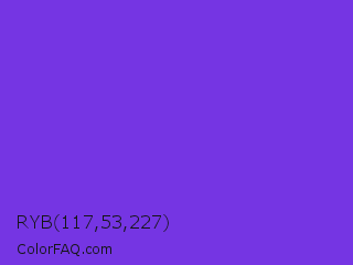 RYB 117,53,227 Color is a normal violet color and the nearest color is Blue Violet #8a2be2. Hex code #7535e3 and RGB value is rgb(117,53,227). In RGB color space, this color is composed of 46% red, 21% green, 89% blue, In CMYK color space, this color is composed of 48% cyan, 77% magenta, 0% yellow , 11% black , In HSL color space, this color has a hue angle of 262° , 76% saturation and 55% lightness.