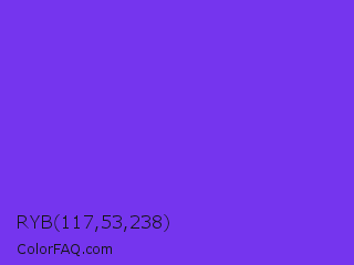 RYB 117,53,238 Color is a normal violet color and the nearest color is Blue Violet #8a2be2. Hex code #7535ee and RGB value is rgb(117,53,238). In RGB color space, this color is composed of 46% red, 21% green, 93% blue, In CMYK color space, this color is composed of 51% cyan, 78% magenta, 0% yellow , 7% black , In HSL color space, this color has a hue angle of 261° , 84% saturation and 57% lightness.