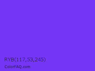 RYB 117,53,245 Color is a normal indigo color and the nearest color is Blue Violet #8a2be2. Hex code #7535f5 and RGB value is rgb(117,53,245). In RGB color space, this color is composed of 46% red, 21% green, 96% blue, In CMYK color space, this color is composed of 52% cyan, 78% magenta, 0% yellow , 4% black , In HSL color space, this color has a hue angle of 260° , 91% saturation and 58% lightness.