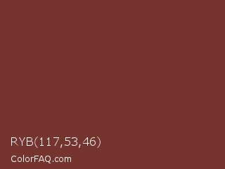 RYB 117,53,46 Color is a normal red color and the nearest color is Wine #722f37. Hex code #75342e and RGB value is rgb(117,52,46). In RGB color space, this color is composed of 46% red, 20% green, 18% blue, In CMYK color space, this color is composed of 0% cyan, 56% magenta, 61% yellow , 54% black , In HSL color space, this color has a hue angle of 5° , 44% saturation and 32% lightness.