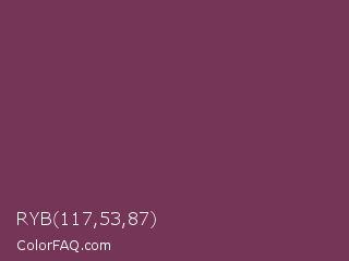 RYB 117,53,87 Color is a normal rose color and the nearest color is Cosmic #76395d. Hex code #753557 and RGB value is rgb(117,53,87). In RGB color space, this color is composed of 46% red, 21% green, 34% blue, In CMYK color space, this color is composed of 0% cyan, 55% magenta, 26% yellow , 54% black , In HSL color space, this color has a hue angle of 328° , 38% saturation and 33% lightness.