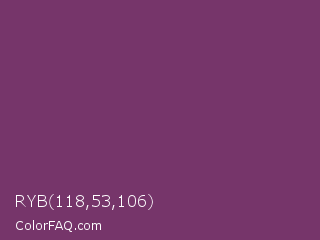 RYB 118,53,106 Color is a normal magenta color and the nearest color is Cosmic #76395d. Hex code #76356a and RGB value is rgb(118,53,106). In RGB color space, this color is composed of 46% red, 21% green, 42% blue, In CMYK color space, this color is composed of 0% cyan, 55% magenta, 10% yellow , 54% black , In HSL color space, this color has a hue angle of 311° , 38% saturation and 34% lightness.